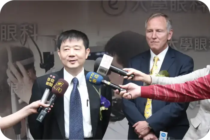 國際眼科權威 Dr. Steve Schallhorn 蕭峰博士 ( 右 ) 參訪大學眼科,並與林丕容總院長 ( 左 ) 接受媒體訪問。