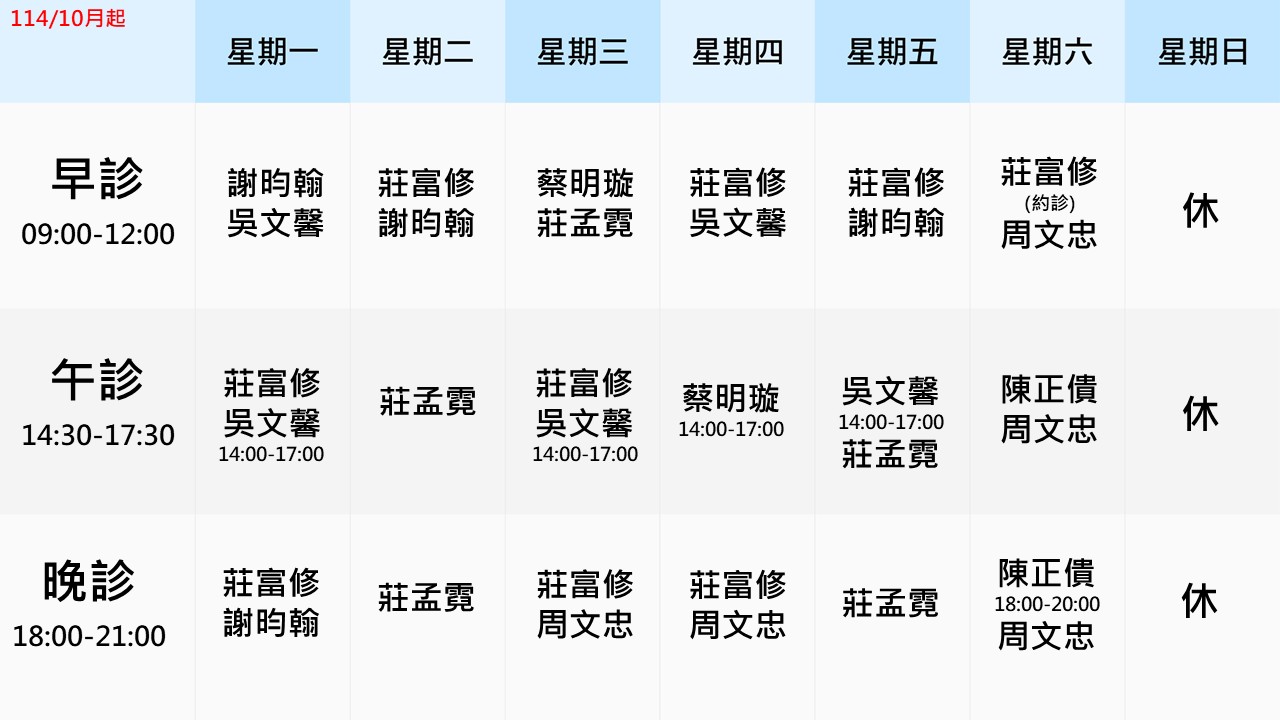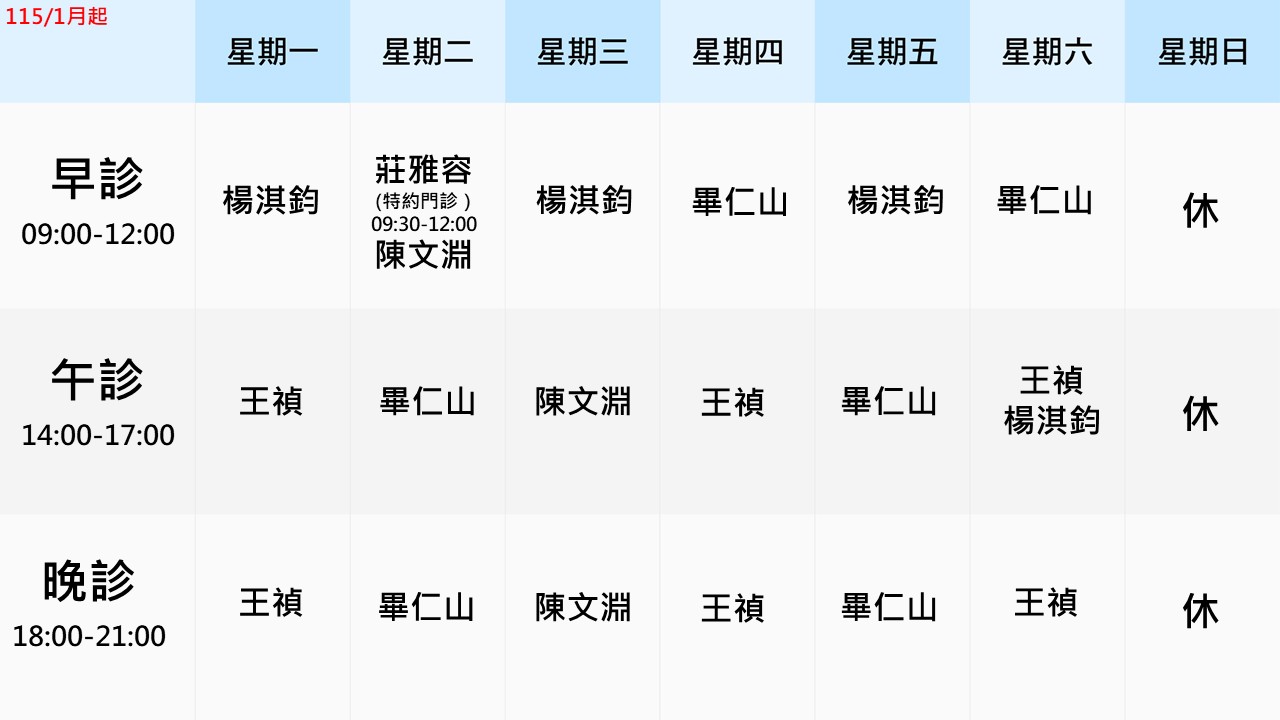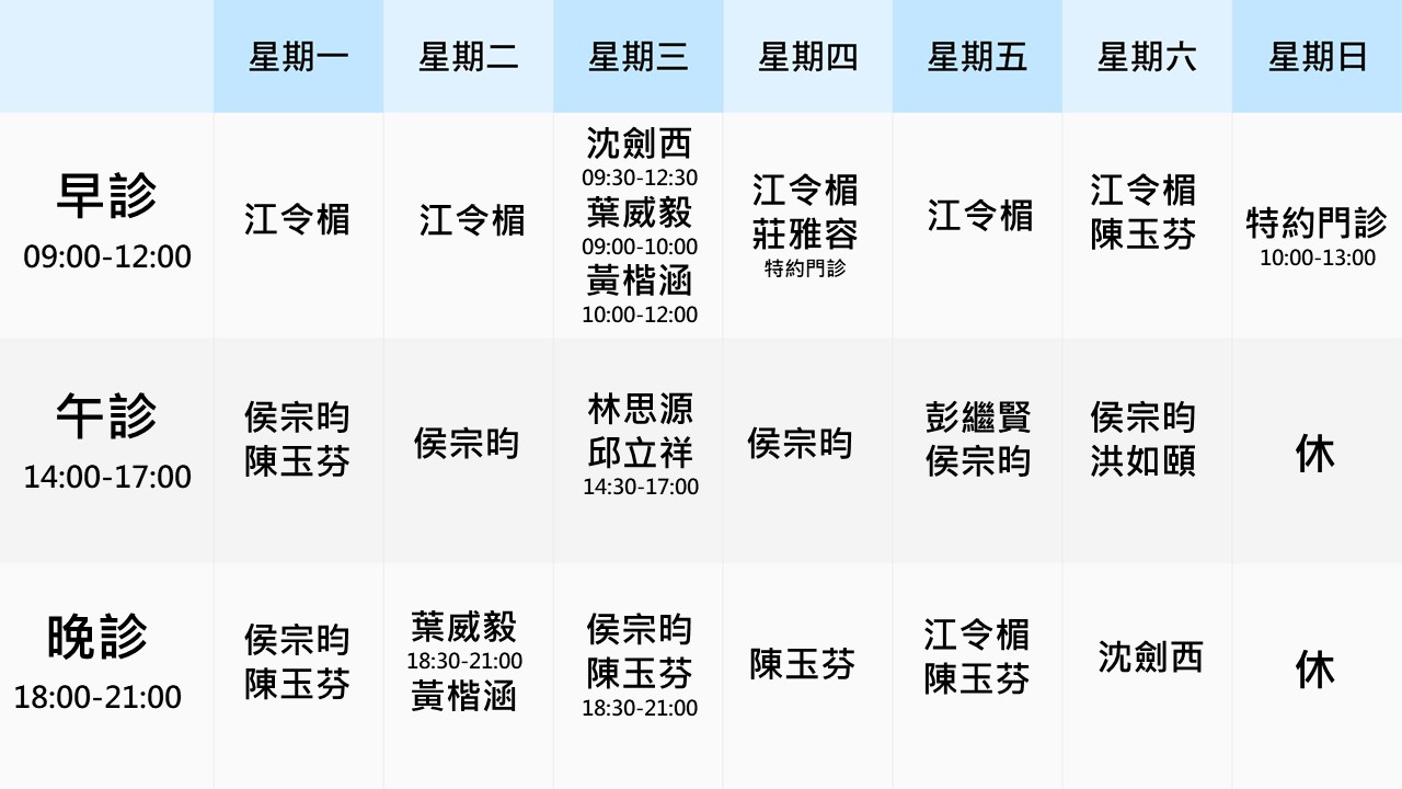 早診9:00-12:00(週三胡裕昇主任早診09:30開始)