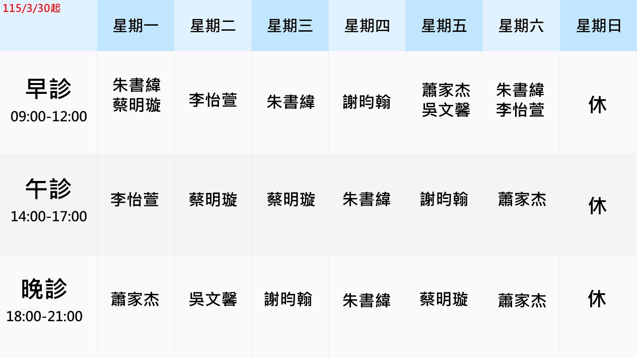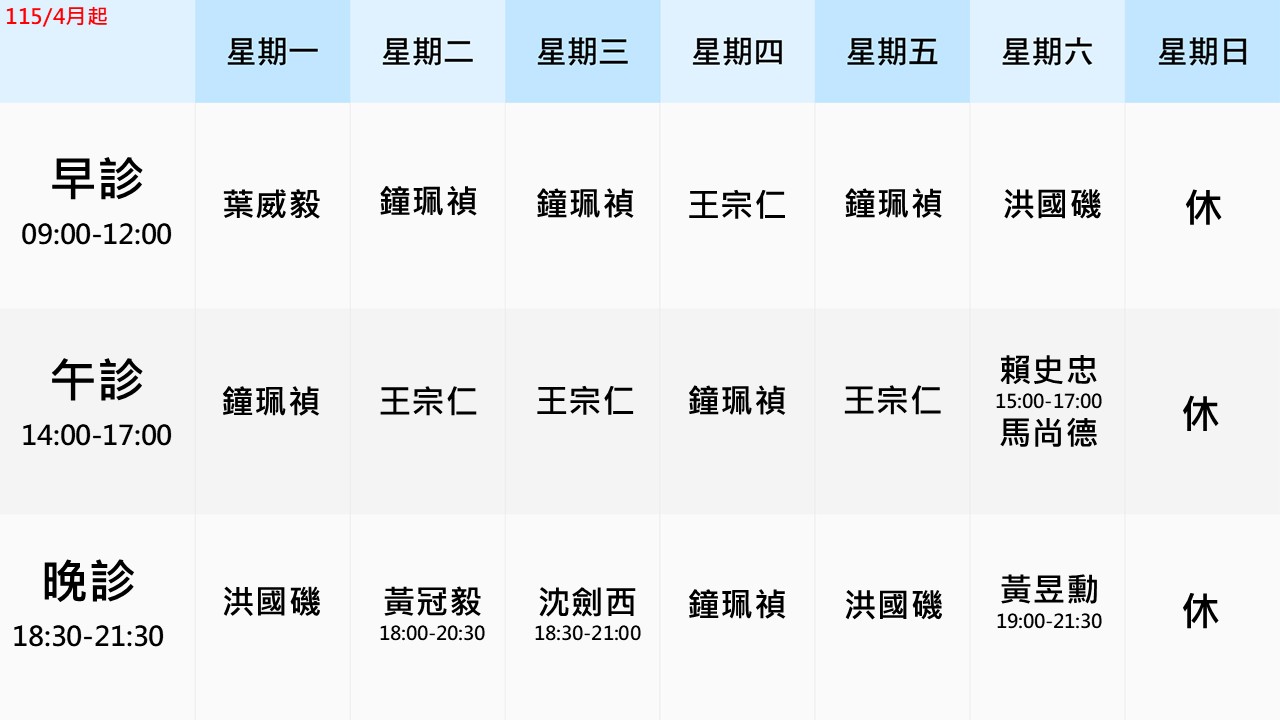 晚診18:00-21:00(週二、週三,胡裕昇主任晚診18:30開始)
