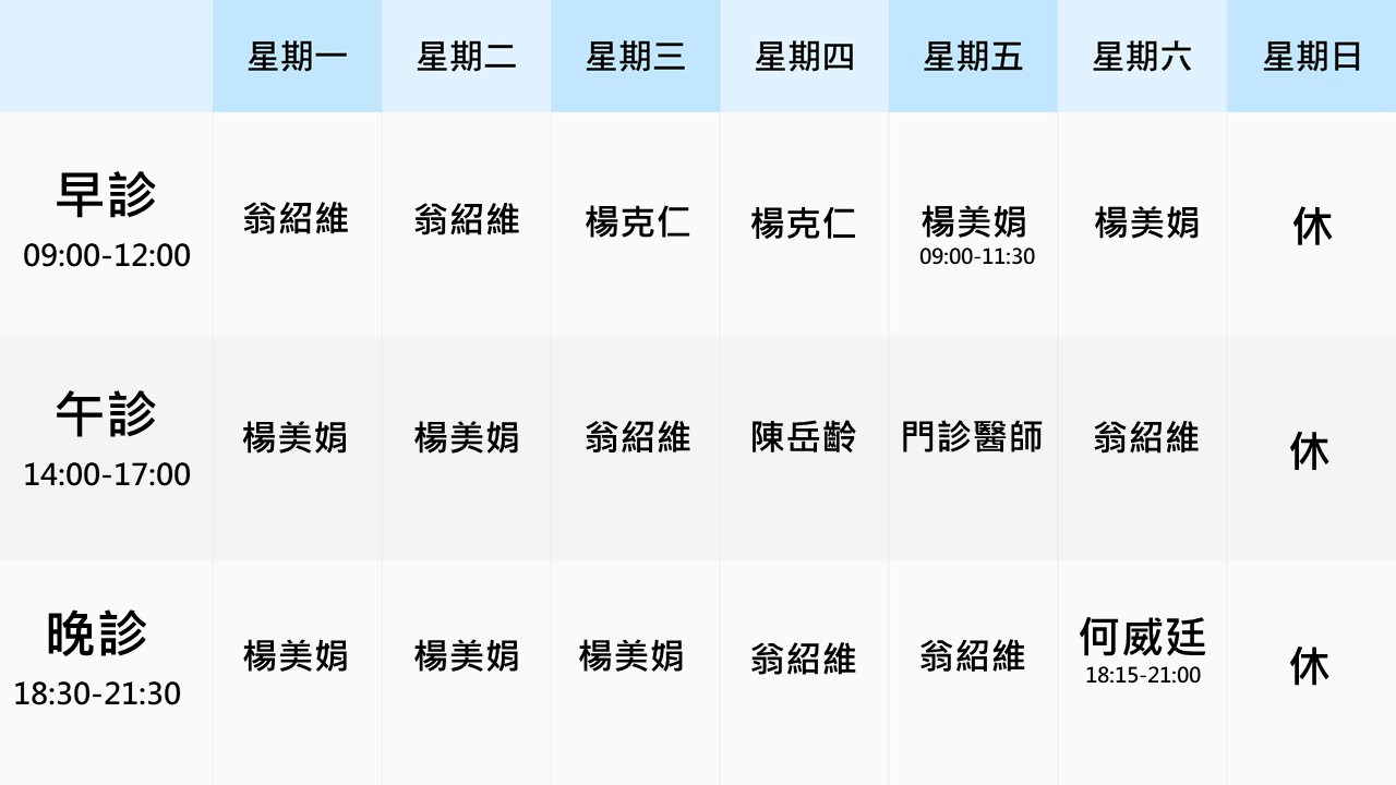 晚診18:00-21:00(自六月起每週六晚診時間18:00-20:00)