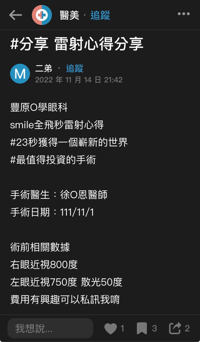 ...劉訢宇的近視雷射推薦 - 豐原大學眼科診所