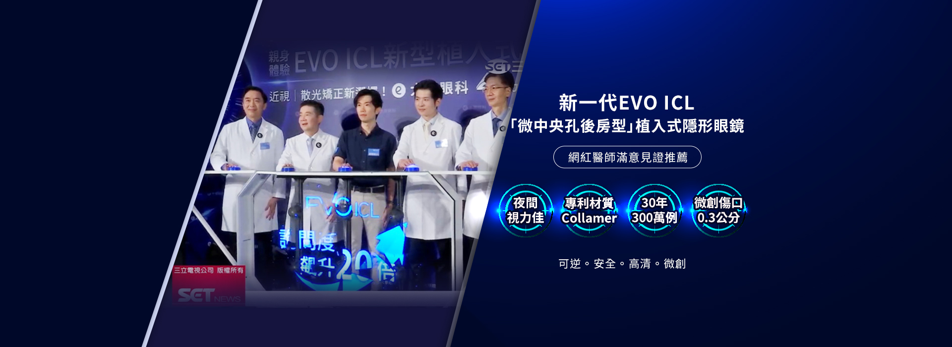「EVO ICL 植入式隱形眼鏡手術」,如同將獨特材質的隱形眼鏡,經由微創技術將個人化定制的微小晶體植入到眼內,Collamer®專利晶體不會和身體產生排斥,可永久置放。又因採取「加法原則」,無需移除原有的角膜組織,無損眼睛結構,它屬於可逆還原式的全新矯正技術,可依需求隨時將植入的晶體取出,無需縫針,能自然癒合,是安全、高效、可靠的新型視力矯正技術。