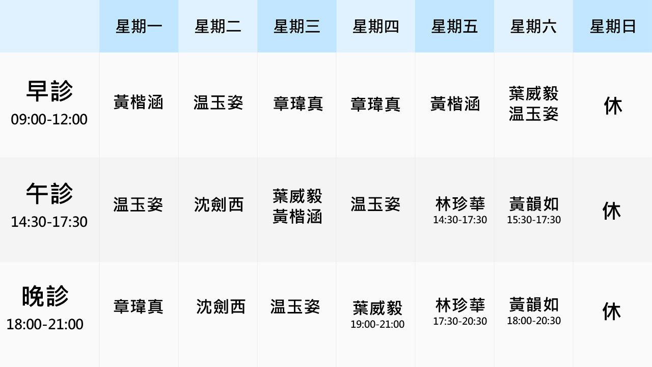 - 【週一至週六】早診09:00-12:00午診14:00-17:00晚診18:00-21:00★週日全日休診