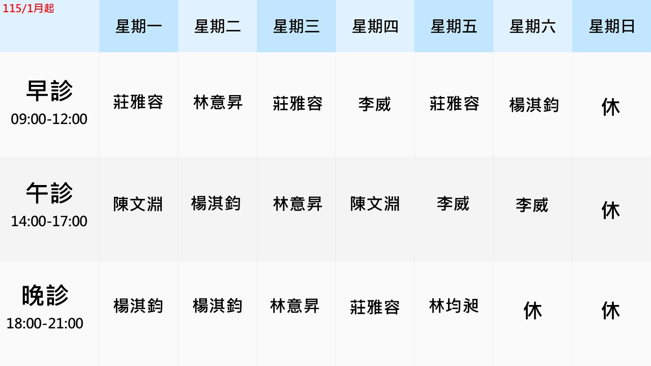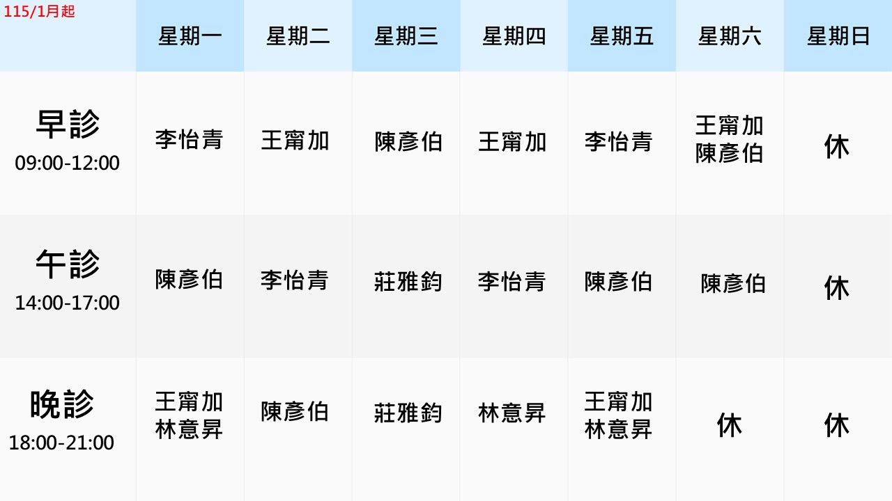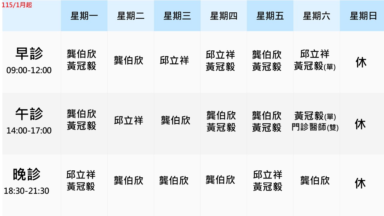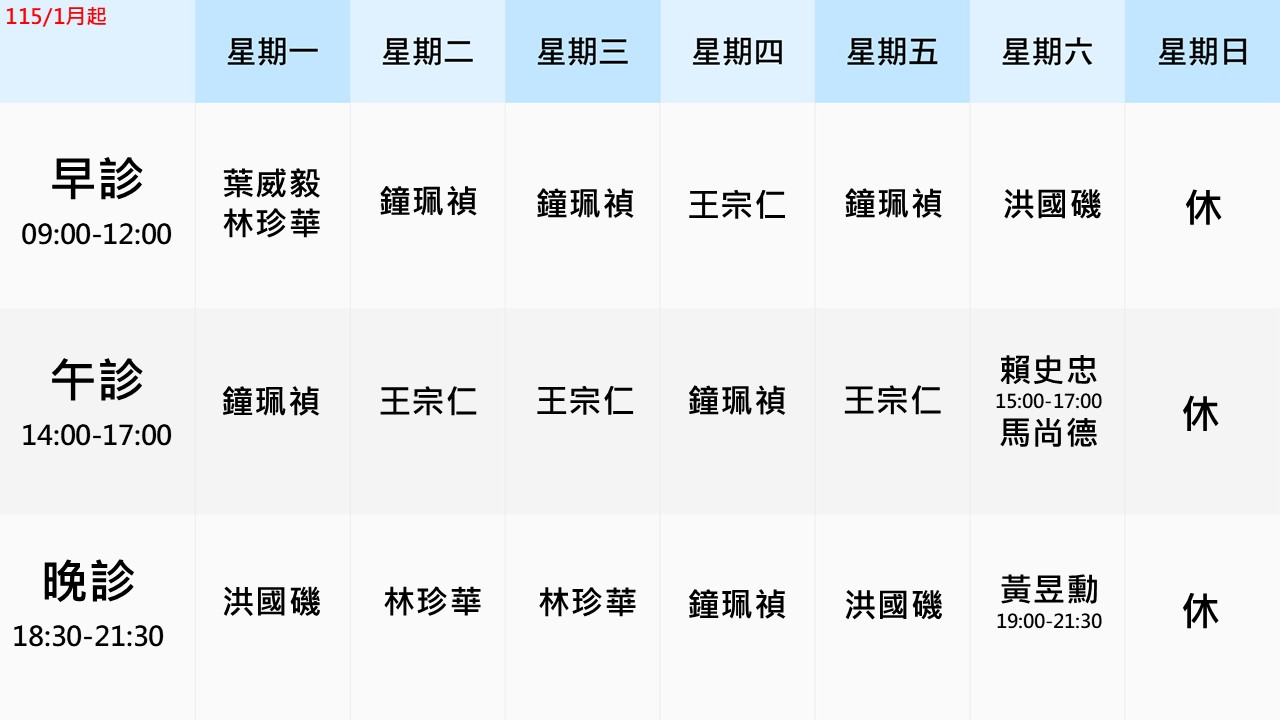 * 此門診資訊僅供參考,煩請於就診前電洽詢問!