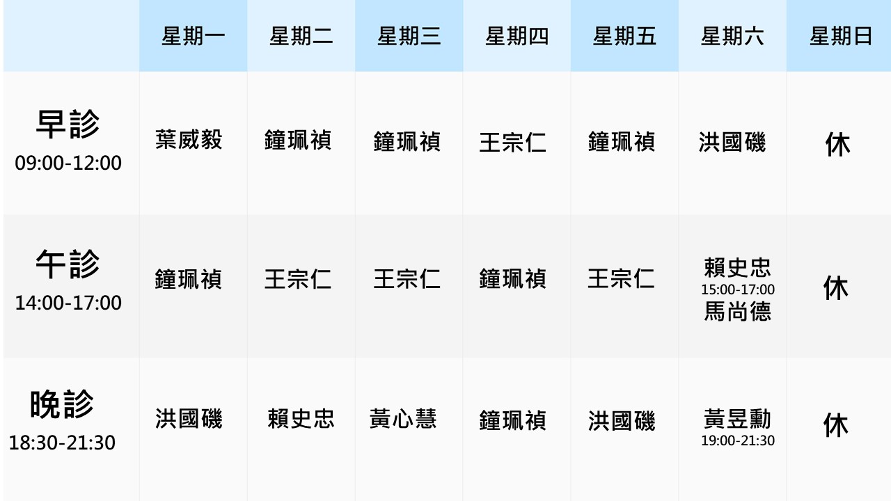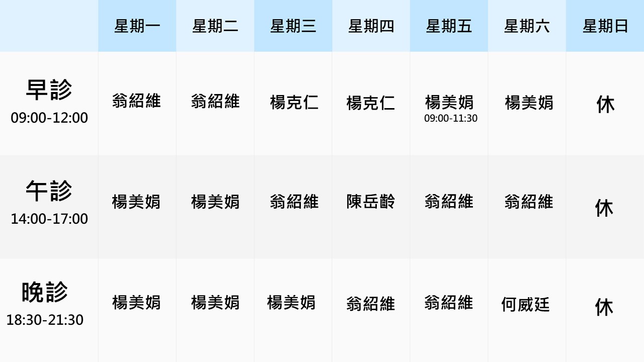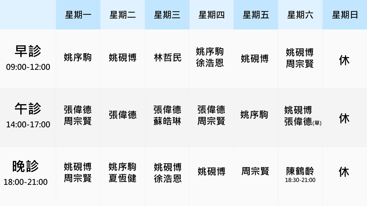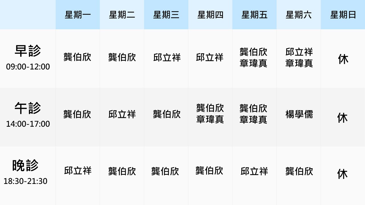 - 【週一至週六】 - 早診9:00-12:00 - 午診14:00-17:00 - 晚診18:00-21:00 - ★週一、週二午診休診 - ★週四早診休診 - ★週日全日休診 - *門診表僅供參考請於就診前電洽詢問!