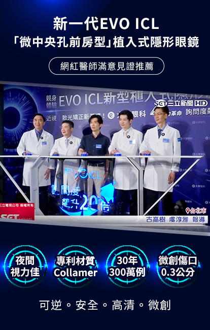 「EVO ICL 植入式隱形眼鏡手術」,如同將獨特材質的隱形眼鏡,經由微創技術將個人化定制的微小晶體植入到眼內,Collamer®專利晶體不會和身體產生排斥,可永久置放。又因採取「加法原則」,無需移除原有的角膜組織,無損眼睛結構,它屬於可逆還原式的全新矯正技術,可依需求隨時將植入的晶體取出,無需縫針,能自然癒合,是安全、高效、可靠的新型視力矯正技術。