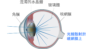白內障是指眼睛裡原本透明清澈的水晶體漸變得混濁甚至硬化,使得光線和影像無法被傳送到視網膜上,導致視線模糊、就像是眼前籠罩一整片或局部白霧一樣,這就是所謂的「白內障」。